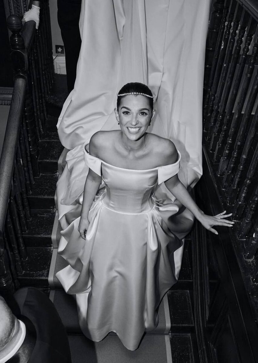 В минувшие выходные британская актриса Мариса Абела (исполнительница роли Эми Уайнхаус в фильме «Обратно во мрак») вышла замуж за своего возлюбленного Джейми Божио, с которым они познакомились во время учебы в Королевской академии драматического искусства. Церемония прошла в кругу семьи и друзей в Восточном Сассексе в старинном поместье XV века. Для важного дня Мариса выбрала классическое белое платье с эффектным шлейфом, а украшения отсылали к образу Одри Хепберн в «Забавной мордашке». И невеста, и вымышленная героиня культовой комедии Джо, выбрали бриллиантовые ожерелья, надетые вместо тиары. Запоминаем проверенный временем прием и применяем его для грядущего значимого повода вместе с опытным стилистом по волосам. У Liza Borzaya для эффектной задумки подойдут сотуар с 88 бриллиантами круглой огранки или ожерелье с бриллиантами огранки бриолет