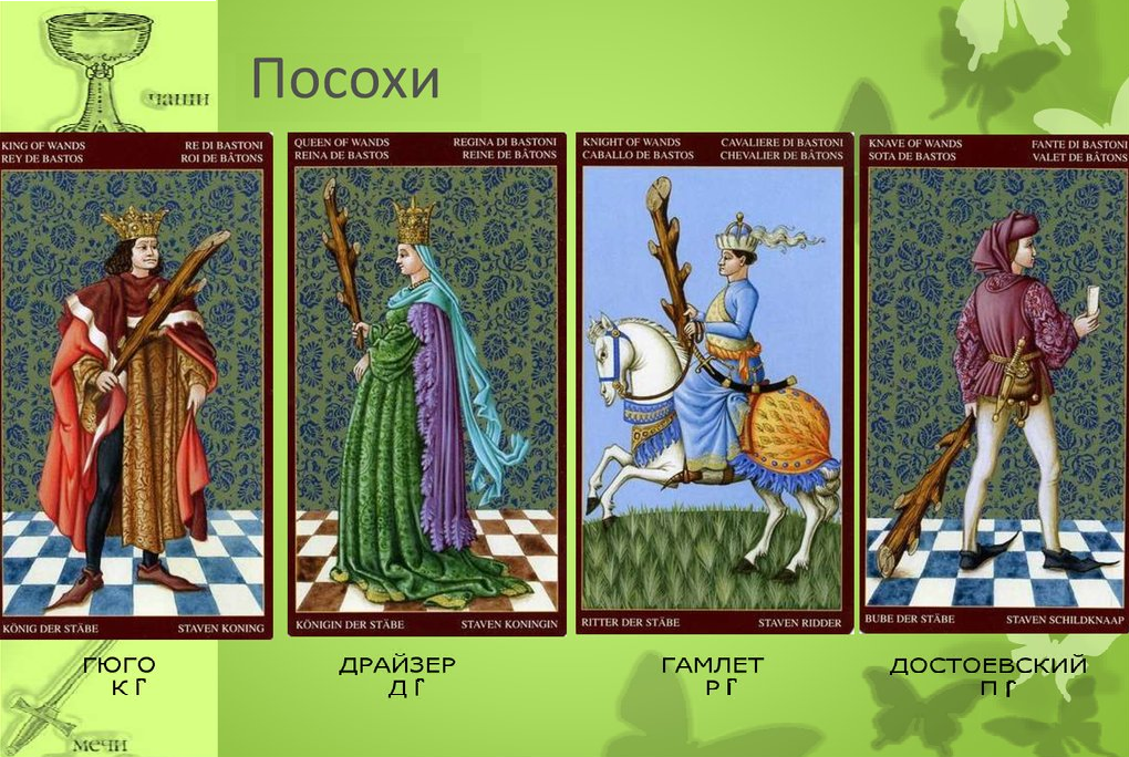 - Паж Кубков (Есенин). Романтичный и коммуникабельный, чувствителен к эмоциональному фону собеседника, очаровывает окружающих, умело управляя их эмоциями. Паж Кубков склонен воспевать прошлое.