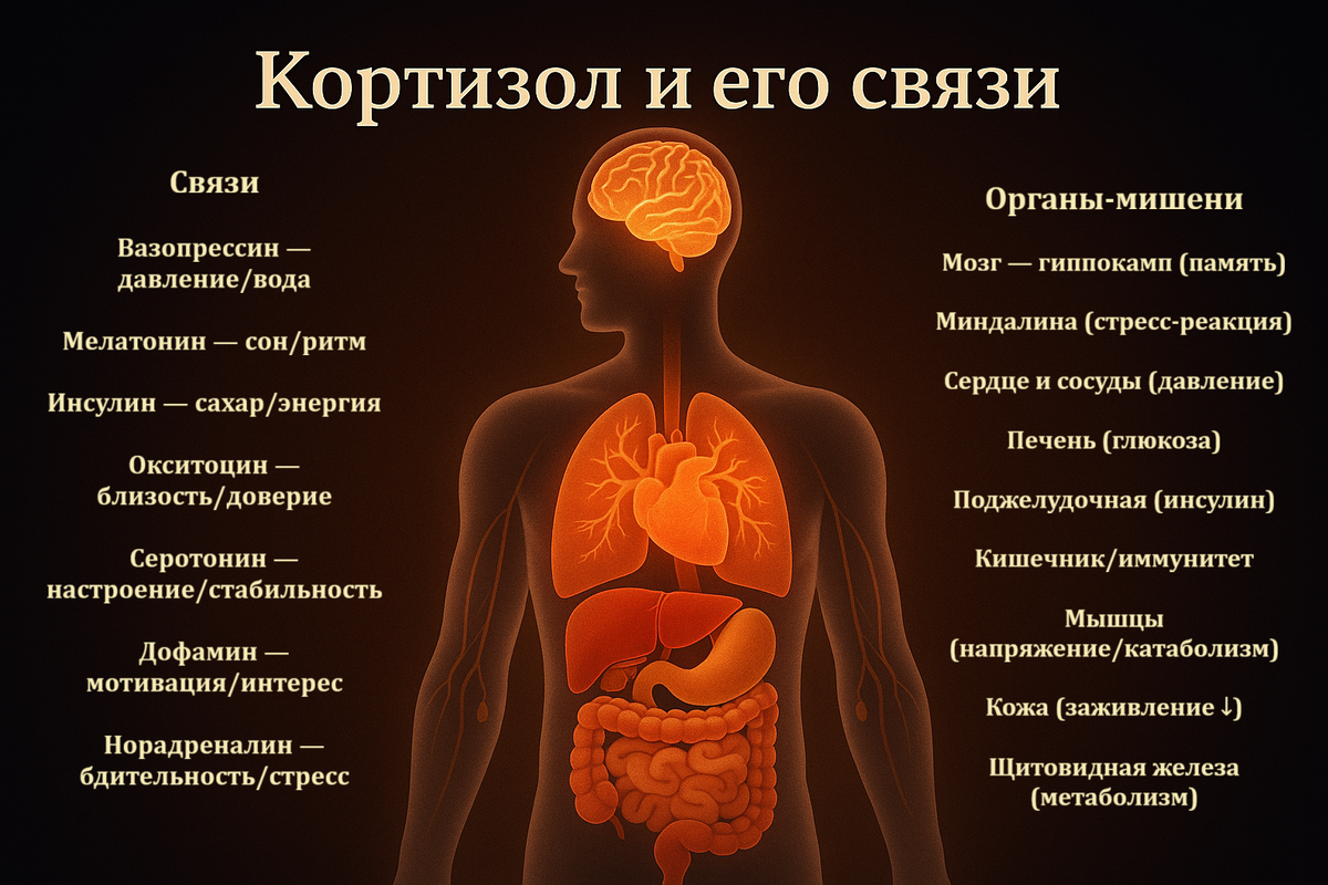 Чтобы понять, где рождается вред, важно видеть кортизол в сети связей с другими гормонами (эндокринная система) и с нейромедиаторами (химия общения нейронов). Тогда становится ясно, почему страдают сон, давление, настроение, память и даже качество близости.