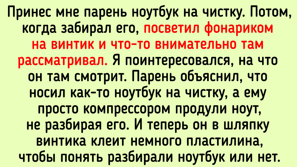 Принес мне парень ноутбук на чистку. Потом, когда забирал его, посветил фонариком на винтик и что-то внимательно там рассматривал. Я поинтересовался, на что он там смотрит. Парень объяснил, что носил как-то ноутбук на чистку, а ему просто компрессором продули ноут, не разбирая его. И теперь он в шляпку винтика клеит немного пластилина, чтобы понять разбирали ноутбук или нет. © Unknown author / Pikabu
