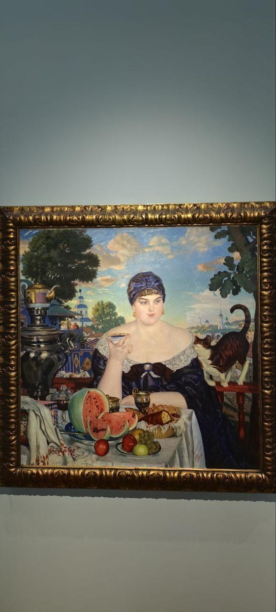 Выставка Кустодиева . Заканчивает работу прекрасная выставка картин Кустодиева в инженерном корпусе Третьяковки. Все мы знаем знаменитую картину с купчихой с чаем, самоваром и кошкой, я её копировала гуашью, фото 1. Но есть и такой портрет купчихи, какое платье и его цвет, фото 2. Также известен портрет Шаляпина на фоне зимних гуляний и слева показаны две его дочери, фото 3. Из региональных музеев привезли картины на выставку и можно увидеть, что Кустодиев прекрасно писал природу, кружевные деревья, иней на ветках зимой, праздничные гуляния, ярмарки, фото 4,5. Также показали портреты кисти Кустодиева, портрет купца, фото 6. Мне очень понравился портрет девушки в бирюзовом платье, фото 7 на чёрном фоне, портрет жены Шаляпина, автопортрет, портрет дочери, фото 8. Отельная комната посвящена театральным работам художника. #Кустодиев #выставкакартин #купчиха #портретШаляпина