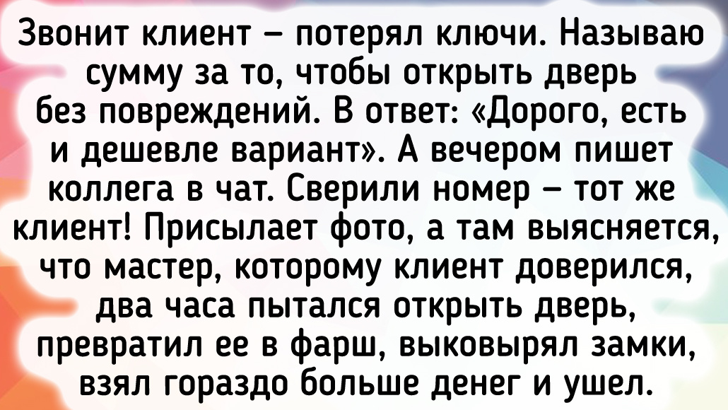Я долго его вспоминала — так приятно было встретить человека, который помогает бескорыстно. © Не все поймут / VK - Звонит клиент — потерял ключи. Называю сумму за то, чтобы открыть дверь без повреждений. В ответ: «Дорого, есть и дешевле вариант». А вечером пишет коллега в чат. Сверили номер — тот же клиент! Присылает фото, а там выясняется, что мастер, которому клиент доверился, два часа пытался открыть дверь, превратил ее в фарш, выковырял замки, взял гораздо больше денег и ушел. © DoktorZamkov / Pikabu