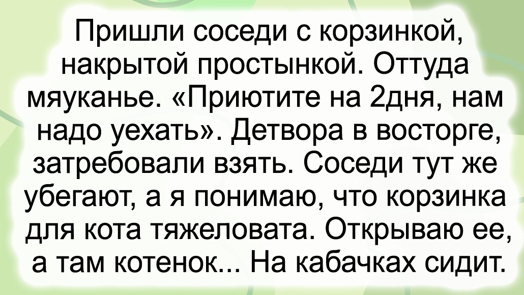 Пришли соседи с корзинкой, накрытой простынкой. Оттуда мяуканье. «Приютите на два дня, нам надо уехать». Детвора в восторге, затребовали взять. Соседи тут же убегают, а я понимаю, что корзинка для кота тяжеловата. Открываю ее, а там котенок. На кабачках сидит. © jesavinka