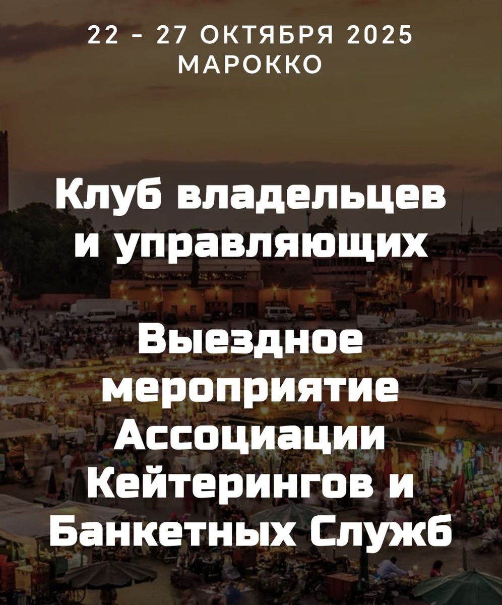 #22октября2025 #23октября2025 #24октября2025 #25октября2025 #26октября2025 #27октября2025 #Марокко #офлайн ⏰ уточняется 📍 Марракеш Longue Vie Hotel 💰 Стоимость от 69.000 руб до 99.000 ❗️ Регистрация https://clc.to/C4DaNw Каждый владелец или управляющий кейтерингом знает: за красивыми банкетами и довольными клиентами скрывается масса ежедневных вызовов. 😟 Как привлечь больше заказчиков? Как отладить процессы, чтобы всё работало без сбоев? Как выстроить команду, которая горит общим делом? 💼 Эти вопросы могут тормозить развитие и мешать двигаться к новым вершинам. 🚧 Но решать их в одиночку — больше не нужно. ✨ «Клуб владельцев и управляющих кейтеринга» — это уникальное пространство, где вы сможете: • открыто обсудить свои сложности с коллегами, которые понимают вас с полуслова; 🤝 • найти новые идеи и решения, проверенные другими руководителями; 💡 • познакомиться с лучшими практиками и инструментами, которые реально работают в кейтеринге. 📈 Вместо лекций — живой обмен опытом