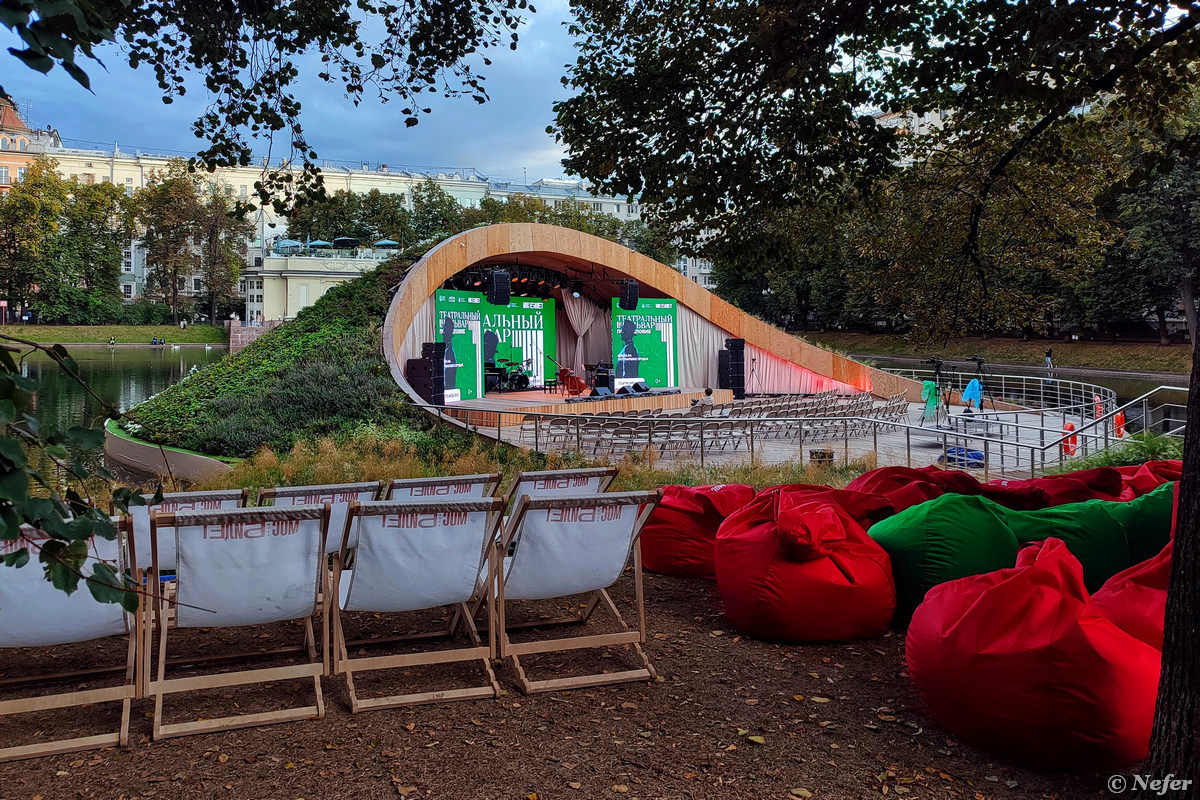 Это сцена на Патриарших прудах, которая в летние месяцы стала площадкой фестиваля "Театральный бульвар". Визуально красивая и эффектно расположенная, однако, совершенно непрактичная. Поначалу там было всего 80 мест, потом количество мест довели до 120. Но все равно этого крайне мало для многомиллионной Москвы. В программе часто была оперетта, которая очень популярна у зрителей "Театрального бульвара". Чтобы попасть на представление, люди приходили за несколько часов и занимали очередь на вход. Как можно было выбрать такую камерную площадку для такого популярного жанра, непонятно. Надеюсь, сделают выводы на будущее. Очень грустно, но в этом году я осталась без оперетты. Фестивальная программа на этой сцене стартовала позже остальных. После завершения фестиваля, сцену на Патриарших прудах оставили, как специальный проект "Театральный бульвар, послесловие". И только в сентябре я наконец попала на эту площадку! Организаторы фестиваля позаботились о комфорте зрителей: на входе предлагали вз