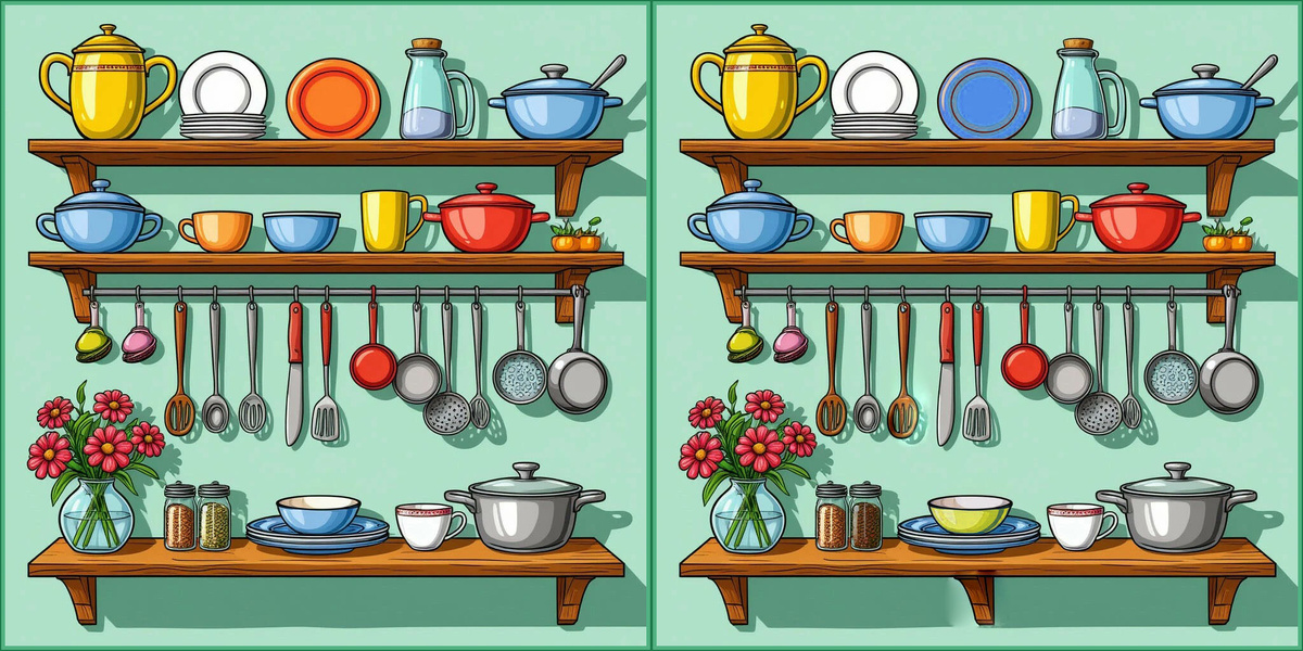 Сегодня предлагаю вам немного похозяйничать на кухне и найти различия между этими изображениями полок с посудой. Сможете заметить все 5 отличий?