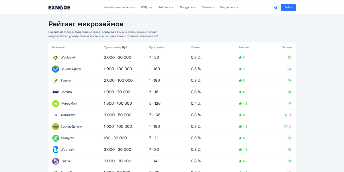 Начинайте с анализа рынка, а не с первой попавшейся рекламы. Самый удобный способ — зайти на сервис Exnode, где собраны отзывы клиентов, условия и свежий рейтинг МФО. Там видно, кто входит в топ, а какие компании лучше обходить стороной. Это экономит время: не нужно вручную проверять десятки сайтов.
