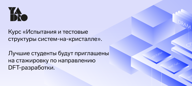 Чем сложнее микросхема, тем сложнее найти в ней ошибку. Массовое производство требует гарантий, что каждая микросхема из миллионов будет работать идеально. Обычными методами это проверить невозможно – слишком долго, дорого и неэффективно. В чем решение? Ответ – проектирование с учетом тестирования (Design For Testability или DFT). Встраивание в микросхему специальных тестовых структур позволяет быстро проверять качество микросхем и снижает их стоимость для конечного потребителя. DFT – это не просто этап разработки, это философия проектирования. В рамках обучения каждый студент сможет: Авторы и ведущие курса – эксперты компании YADRO. Основой программы курса «Испытания и тестовые структуры систем-на-кристалле» является многолетний практический опыт инженеров ведущей российской технологической компании, которым они готовы поделиться со слушателями