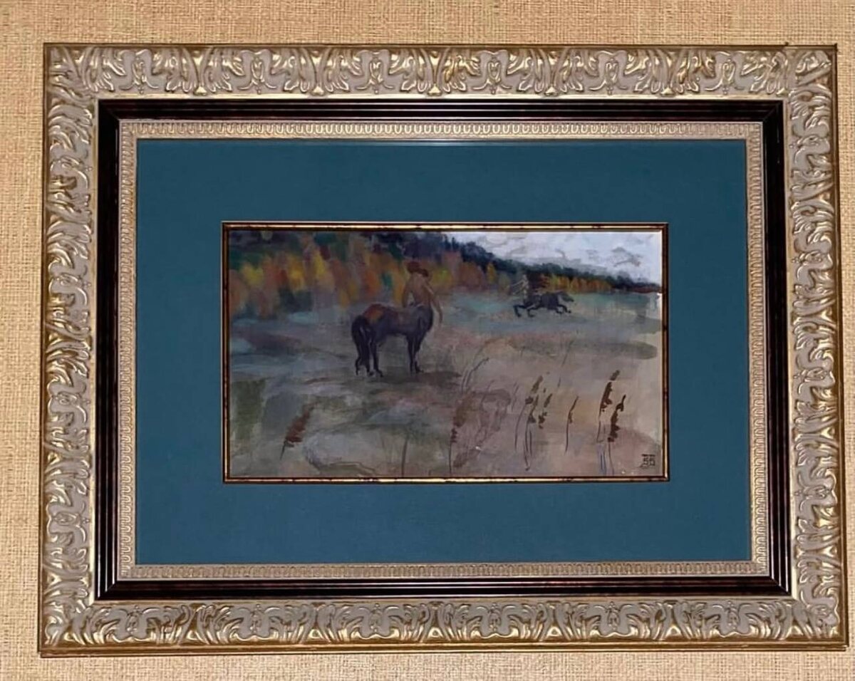 Василий Владимиров «Кентавры», превосходный рисунок эпохи русского модерна в живописи и серебряного века в поэзии, иллюстрация стихотворения Николая Гумилева, вернее его перевода «Побега Кентавров» Жозе де Эридиа, вышедшего в сборнике Гумилева «Трофеи» и в сборниках его переводов французской поэзии 1912-1920 годов. Бумага, акварель, двойное паспарту с золотым фигурным кантом, багет, размер вместе с рамой 37х48 см. Владимиров Василий Васильевич (1880-1931), «Мир искусства», «Бубновый валет», модерн, авангард, ну и главное: один из ведущих представителей течения символистов в изобразительном искусстве, был близко знаком и с Николаем Гумилевым и с Андреем Белым и с Блоком и с Бальмонтом. Провенанс работы связан с личным собранием Ахматовой, но без каких-либо документальных подтверждений. Но бумага и краски безусловно той эпохи, а манера и подпись вообще не подлежат сомнению.