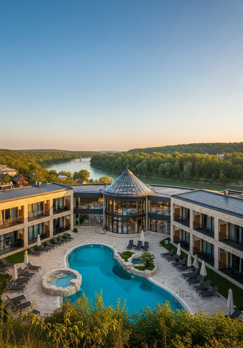Номера оборудованы панорамными окнами с видами на реку и горы. Территория включает спа-центр, рестораны, детские площадки и разнообразные развлечения. Особенностью отеля является собственная скважина с минеральной водой и бельчатник — уникальная изюминка комплекса.