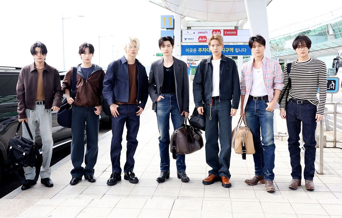 Семь участников — Хисын, Джей, Джейк, Сонхун, Сону, Чонвон и Ники — сразу же привлекли внимание своими выразительными внешними данными и ярким, индивидуальным стилем. Каждый участник продемонстрировал уникальный образ, идеально балансируя между шикарным минимализмом и смелой современной эстетикой. Естественно, все наряды, надетые для появления в аэропорту, были от Prada.