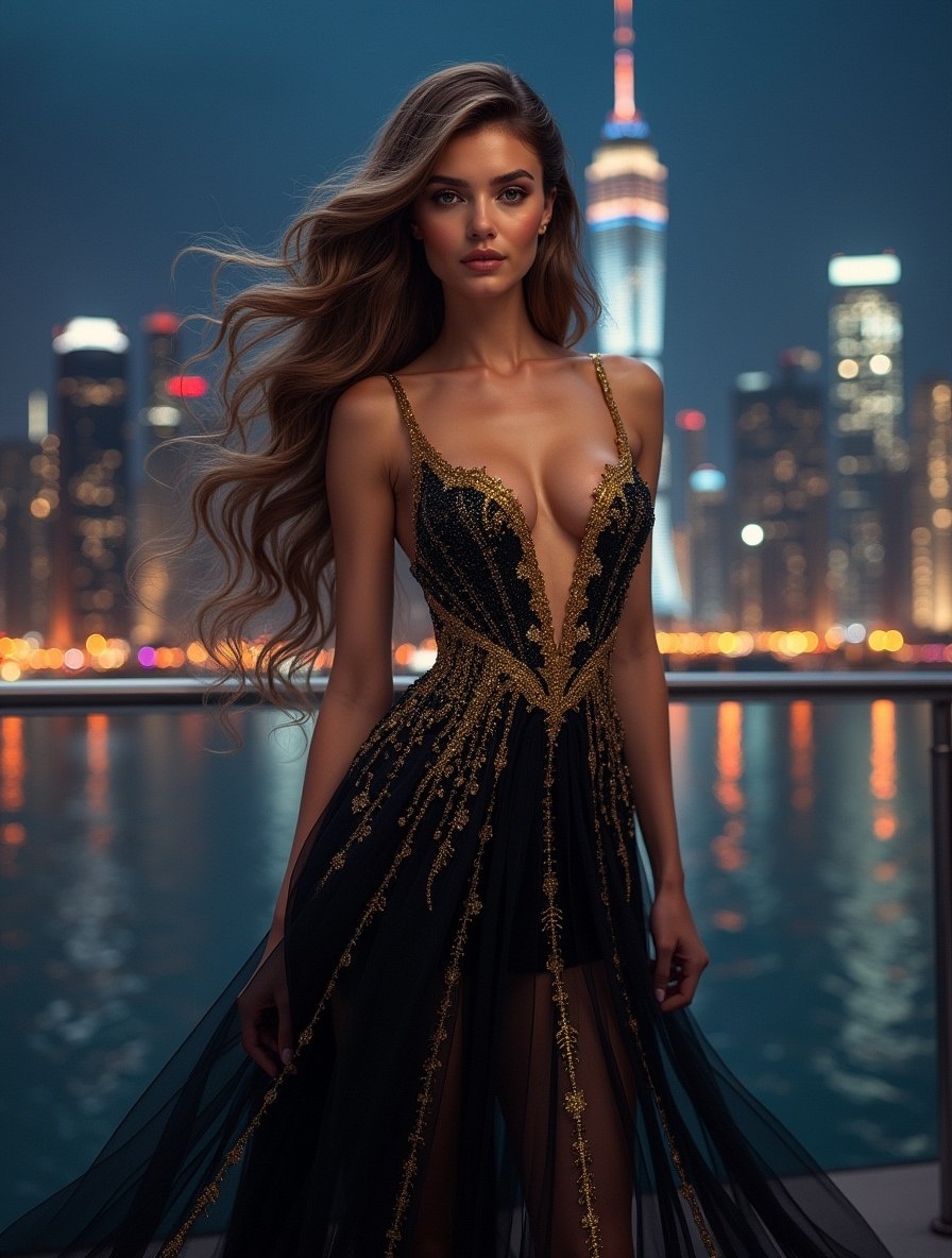 Девушка на фоне ночного городского пейзажа. Промпт: Изображение представляет собой цифровую иллюстрацию, на которой изображена женщина в гламурной обстановке. Стиль представляет собой смесь реализма и фантазии, с акцентом на сложные детали и яркие цвета. Макет вертикальный, в центре - женщина, стоящая на фоне ночного городского пейзажа. У нее светлая кожа и длинные распущенные волосы, украшенные золотыми блестками, которые сочетаются с мерцающими деталями ее элегантного черного платья. Платье украшено золотыми вставками, которые ниспадают каскадом, создавая ощущение движения и роскоши. Городской пейзаж за ее спиной освещен, небоскребы и огни отражаются в воде, добавляя пейзажу глубины и контрастности. Общая композиция создает ощущение элегантности и утонченности при гармоничном балансе между объектом съемки и фоном. Нейросеть: Leonardo. Preset: Flux. #нейросеть #красиваядевушка #брюнетка #цифровоефото #девушка #идеи #рисунок #цифроваяживопись #нейроарт #digitalart #артыотнейросетей