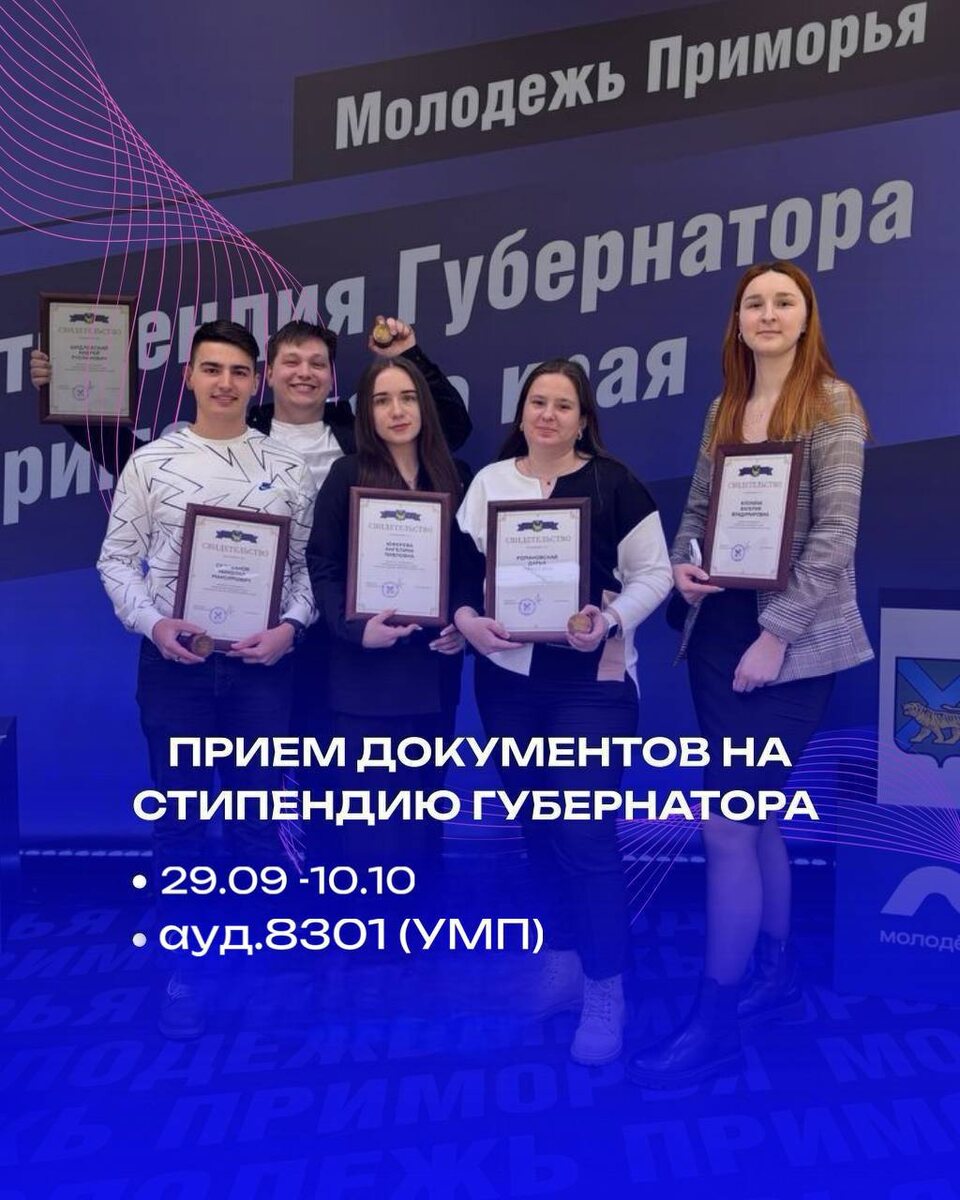 Ты точно ждал именно этого поста!⬇️ Приём документов на стипендию губернатора Приморского края объявляется открытым!🎉 💡Запоминай: ▫️с 29 сентября по 10 октября (только в будние дни) ▫️с 10:00 до 17:30 ▫️в Управлении молодёжной политики (ауд. 8301) ‼️Собирай все свои достижения с 01.03.2025 по 15.09.2025 и скорее подавайся! Документы, которые тебе нужны↘️ 📝В бумажном виде: 1. Анкета 2. Заверенная копия зачетной книжки 3. Копия паспорта 4. Справка-выписка о реквизитах счета 5. Характеристика 6. Согласие 🖥В электронном виде: 1. Анкета 2. Документы подтверждающие твои достижения 3. Справка-выписка о реквизитах счета Все шаблоны документов ты можешь найти по ссылке ⬅️ А если у тебя остались какие-то вопросы, задавай их Диме @Yudin_Dmitril или Соне @Sophi_Liss✨