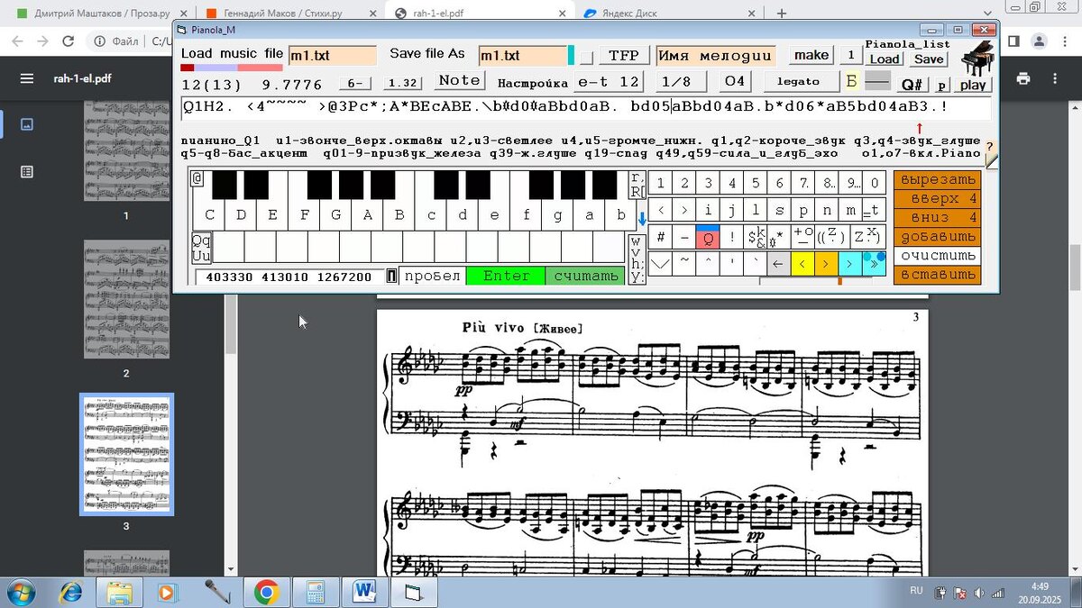 Ноты Элегии С.Рахманинова я скачал в виде PDF файла и открыл этот файл в своём браузере Гугл. Нотными листами занят целиком весь экран ноутбука. Что касается окна программы «Пианола_М», то оно достаточно узкое, и расположить его можно так, чтобы хорошо видеть те нотные строки, с которыми работаешь. Кроме того, имеется наготове программа Калькулятор - иногда нужно подсчитать или запомнить количество семплов в фрагменте нотной записи, и документ Ворд со статьёй «Мнемонический нотный язык Пианолы» - для наведения справок по этому языку.