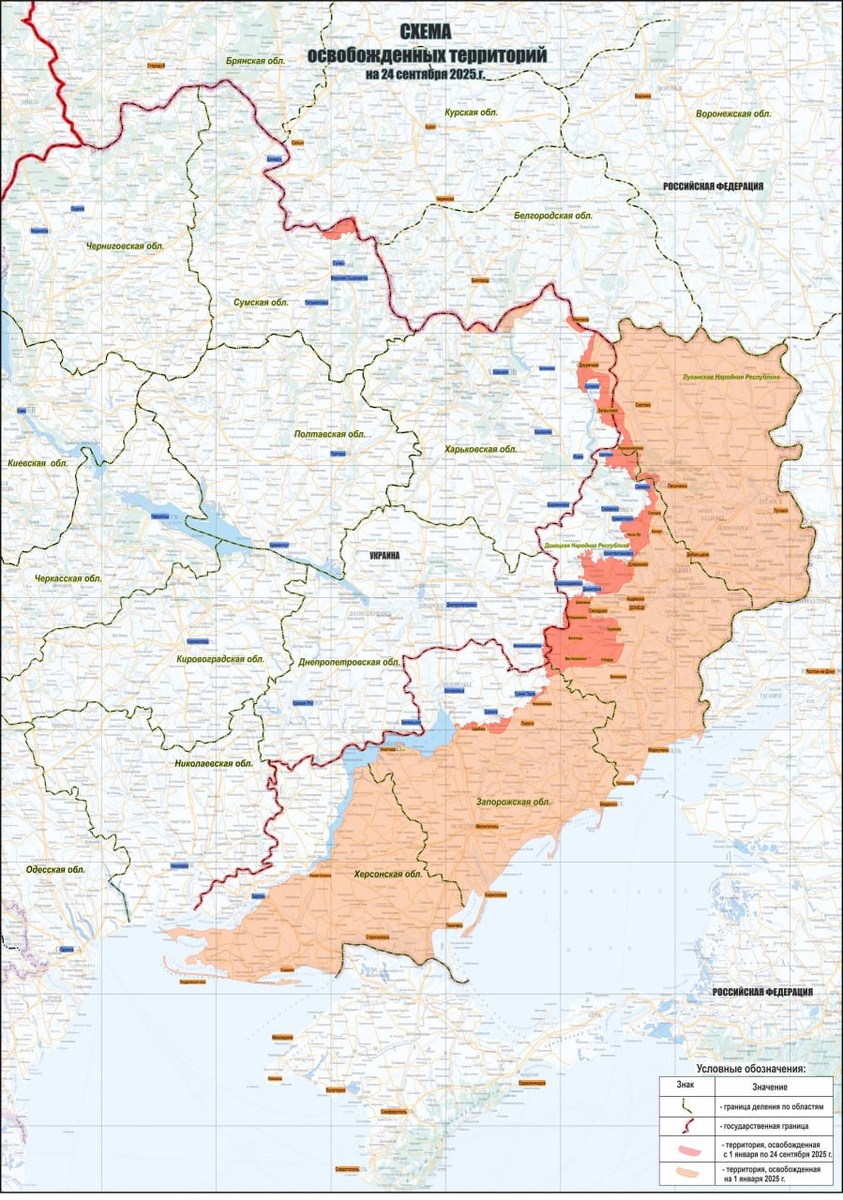 Ну что, друзья, как это ни печально, но 2025 год постепенно двигается к своему финалу. Хотя до нового года еще больше трех месяцев, начинается подведение итогов. Министерство обороны РФ отчиталось, что с 1 января 2025 года по 25 сентября 2025 года было освобождено 205 населенных пунктов, более 4 714 квадратных километров. Из них освобождено: ▪️В Донецкой Народной Республике свыше 3 308 кв.км, ▪️В Луганской Народной Республике более 205 кв.км, ▪️В Харьковской области свыше 542 кв.км, ▪️В Запорожской области более 261 кв.км, ▪️В Сумской области свыше 223 кв.км, ▪️В Днепропетровской области более 175 кв.км. Учитывая, что до конца года еще есть время, ждем освобождение новых городов и территорий. Особенно Купянск, Северск, Покровск и Мирноград