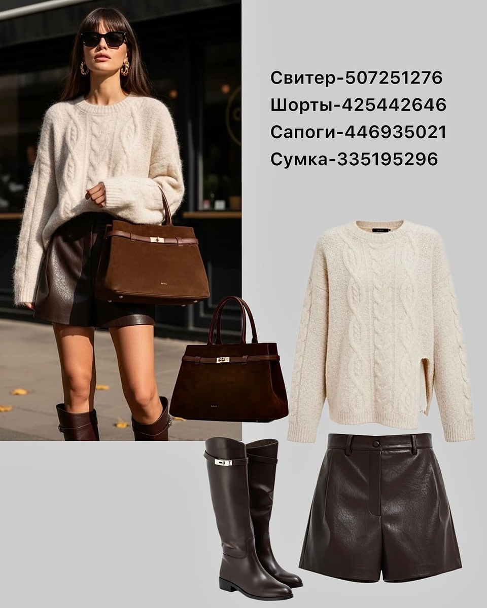 В первом образе: свитер 507251276, шорты 425442646, сапоги 446935021, сумка 335195296 — уютная классика с характером.