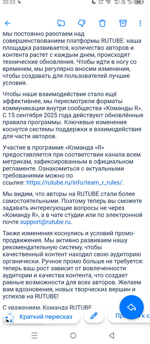 В начале года я попросился в команду р со своими мотивами. 😁 конечно все было в том что хотел попасть категорию. Но сколько бы я не писал меня не добавили туда, в категорию. По началу было интересно узнавать новости раньше чем многие . Но все это закончилось. С 15 сентября решили изменить команду р и просто вырезать половина народу. По просмотрам, глубине и много чему мой канал проходил. Ток обложек небыло на видео в основном, но это тайна покрытая мраком из-за чего меня турнули от туда. Жалание вернуться у меня больше нет. Если кто хочет смотреть дальше видео переходите на вк там дальше будут выходить видео Здесь чисто статьи буду стараться писать .так как дзен тоже кинул авторов с манетой. Увы наша реальность такова. Охота было на деньги с манеты купить оборудование которого нету у меня. Вот скрин письма который мне пришел. Тех которых взяли там ссылка на телеграм канал. И да не пытайтесь туда вступить смысла не какого нет. В том что продвижение которое вроде как было чистой вод