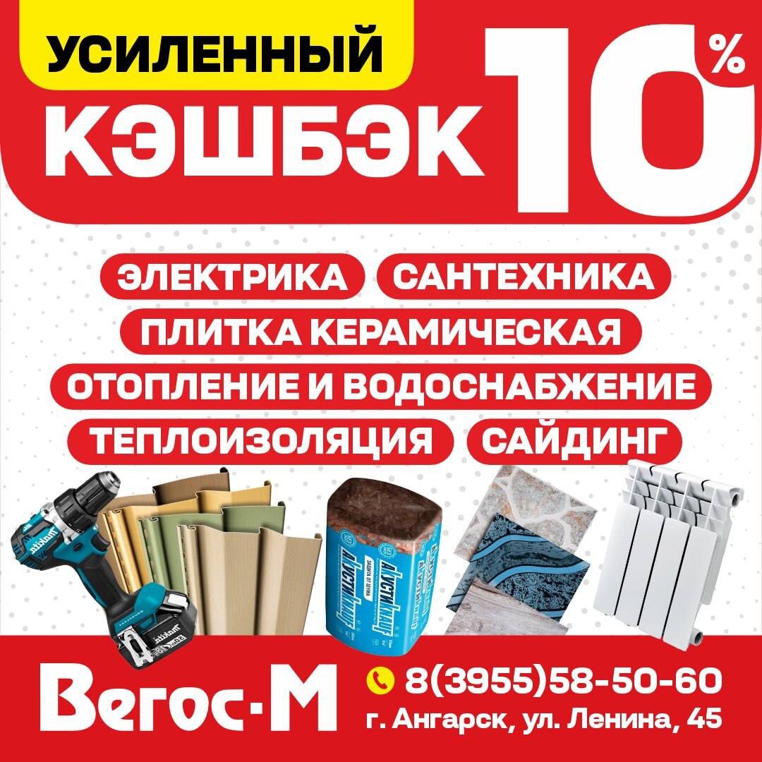 Только с 12 сентября по 28 сентября получите увеличенный кэшбэк 10% на огромный ассортимент товаров в строительном магазине Вегос-М!