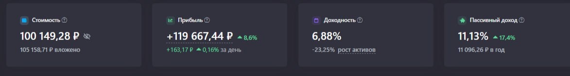 100к на балансе, но думаю, что ещё просядет и примерный дивидендный доход за год 11096 рублей🤑