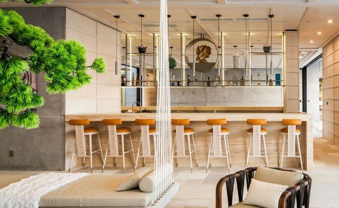 За счет этого вида и лаконичного дизайна, а также расположения мебели, гостиная создает ощущение простора, легкости и связи с природой. Современный дизайн,натуральные материалы и панорамный вид на океан делают это место идеальным для отдыха и развлечений. ✨ 🌊 Кухня поддерживает минималистичный декор гостиной, но особую изысканность ей придает столешница из искусственного камня.В данном интерьере столешница из искусственного камня имеет нейтральный цвет,что позволяет ей гармонично сочетаться с другими элементами кухни, такими как деревянные панели, оранжевые барные стулья и бетонная стена. 🪵 Столешница плавно переходит в барную стойку, создавая единое пространство для приготовления пищи и отдыха. В целом, эта кухня демонстрирует элегантное сочетание современных материалов и минималистичного дизайна, где столешница из искусственного камня играет важную роль в создании стильного и практичного интерьера. ✨