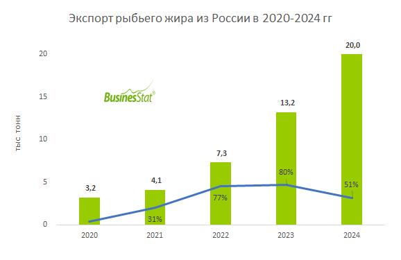 В 2020-2024 гг экспорт рыбьего жира из России увеличился более чем в 6 раз: с 3,2 до 20,0 тыс т.