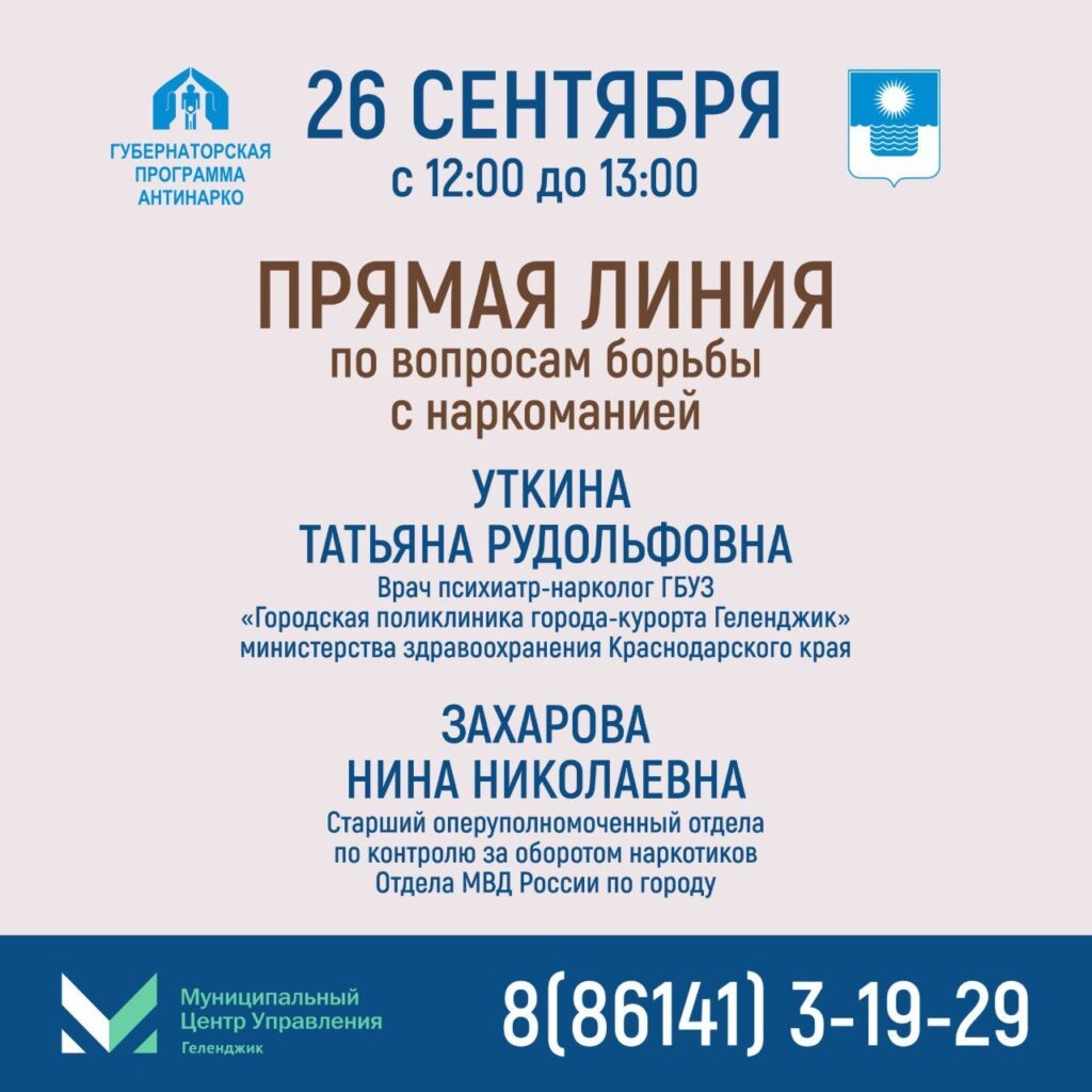 В Геленджике каждый желающий 26 сентября с 12:00 до 13:00 сможет получить профессиональную консультацию по вопросам, связанным с наркотической и алкогольной зависимостями. «Врач психиатр-нарколог Татьяна Рудольфовна Уткина проведет прямую линию в Муниципальном центре управления. Она ответит на вопросы, которые, возможно, вы боялись или стеснялись задать. Мы гарантируем, что консультация будет абсолютно анонимной», — сообщает МЦУ Геленджика. В прямой линии примет участие старший оперуполномоченный отдела по контролю за оборотом наркотиков Отдела МВД России по городу Геленджику Нина Николаевна Захарова. Если ваши близкие оказались в беде или вам известно о фактах распространения наркотических средств, звоните по телефону: +7(86141)3-19-29 в указанный период.