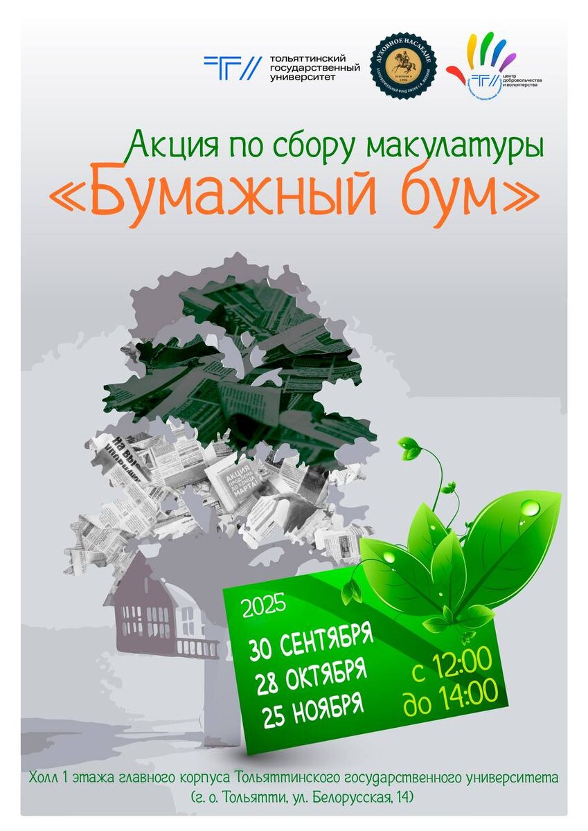 📢 Несите бумагу – спасайте планету! В ТГУ начался новый сезон «Бумажного бума» – традиционной акции по сбору макулатуры. 📆 30 сентября, 28 октября и 25 ноября ⏰ с 12:00 до 14:00 📍 Холл главного корпуса ТГУ (ул. Белорусская, 14) Сдавать разрешено: 🔹 белую и цветную бумагу (линованную, офисную, копировальную и обёрточную); 🔹 открытки и бумажные конверты (без пластикового окна); 🔹 картонные изделия; 🔹 бумажные упаковки и пакеты; 🔹 книги, газеты, журналы и другую полиграфию. Вырученные во время акции средства перечисляются на реализацию проекта «Мемориальный комплекс ТГУ». Он осуществляется университетом совместно с благотворительным фондом «Духовное наследие» имени С. Ф. Жилкина и Тольяттинской епархией.