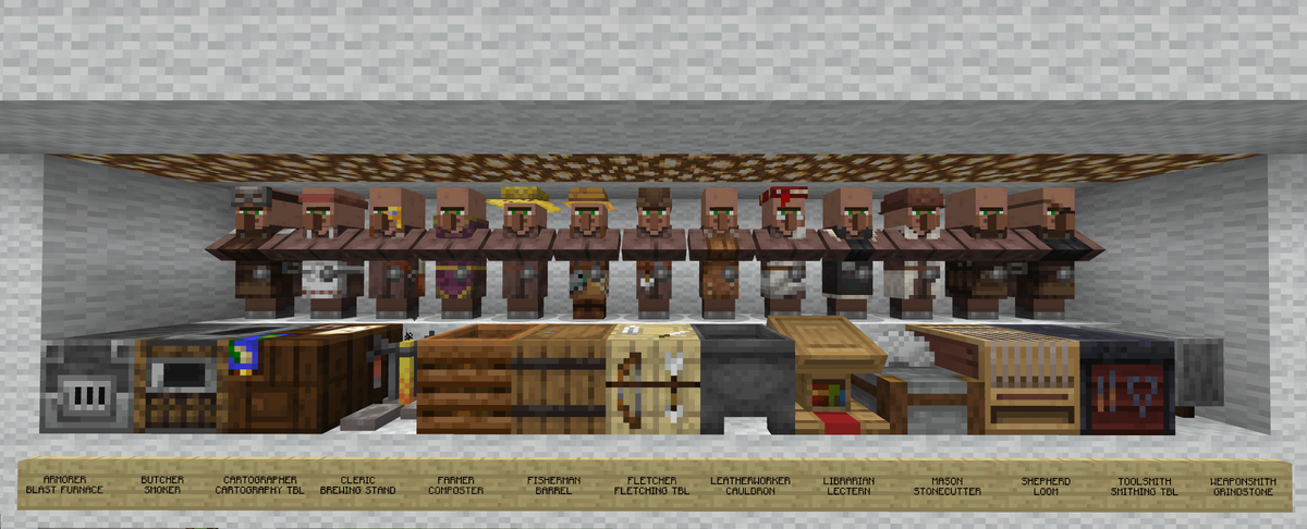 Все профессии жителей в формируются через взаимодействие с уникальными рабочими блоками, которые задают их роль в деревне. Изначально жители появляются без профессии, но, найдя подходящий блок, они обретают одну из 13 специальностей.