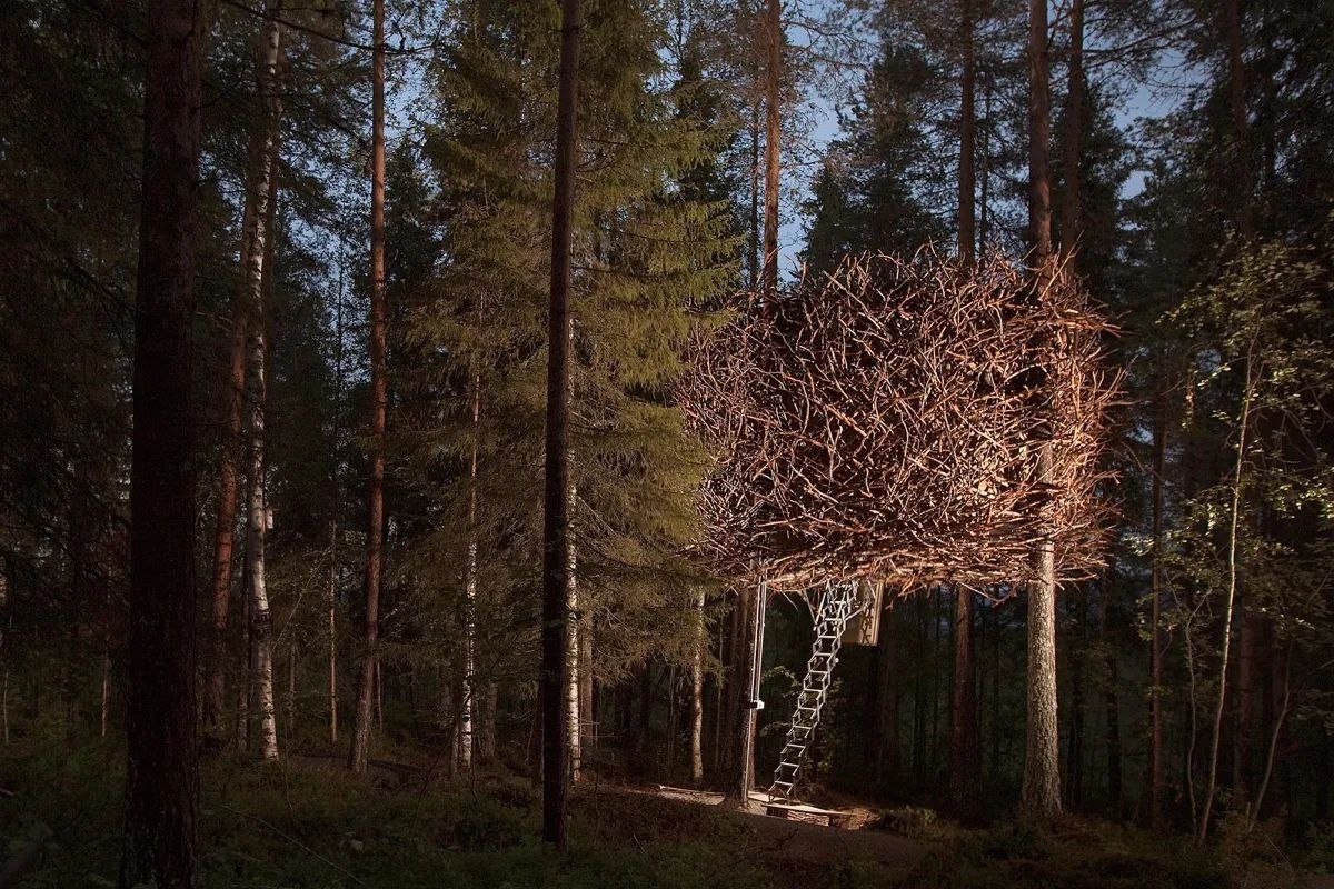 Загородный отель Treehotel из номеров на деревьях находится в шведском лесу около города Харадас. Сама по себе идея построить что-нибудь среди зеленых крон не нова. Необычность состоит в том, что это круглогодично функционирующая гостиница, а не экскурсионный объект или чья-то дача Мы неоднократно отмечали, что риск поломки в отеле выше, чем в аналогичном по площади жилом доме. Писали также о разнице в организации пространства. Построить дом на дереве — довольно нетривиальная задача. Более того, его нужно ещё и обслуживать. Видимо, для технического персонала обслуживание объекта становится не меньшим приключением, чем проживание для гостей! Каждому из нас было бы интересно узнать финансовую модель такого необычного глэмпинга. Очевидно, что цифры закрыты, но на сайте цены стартуют от 15-60 тысяч, в зависимости от номера, если пересчитать в рубли. Делать расчеты настолько уникальных объектов сложно в первую очередь потому, что не ясны расходы. Довольно необычный пример для вдохновен