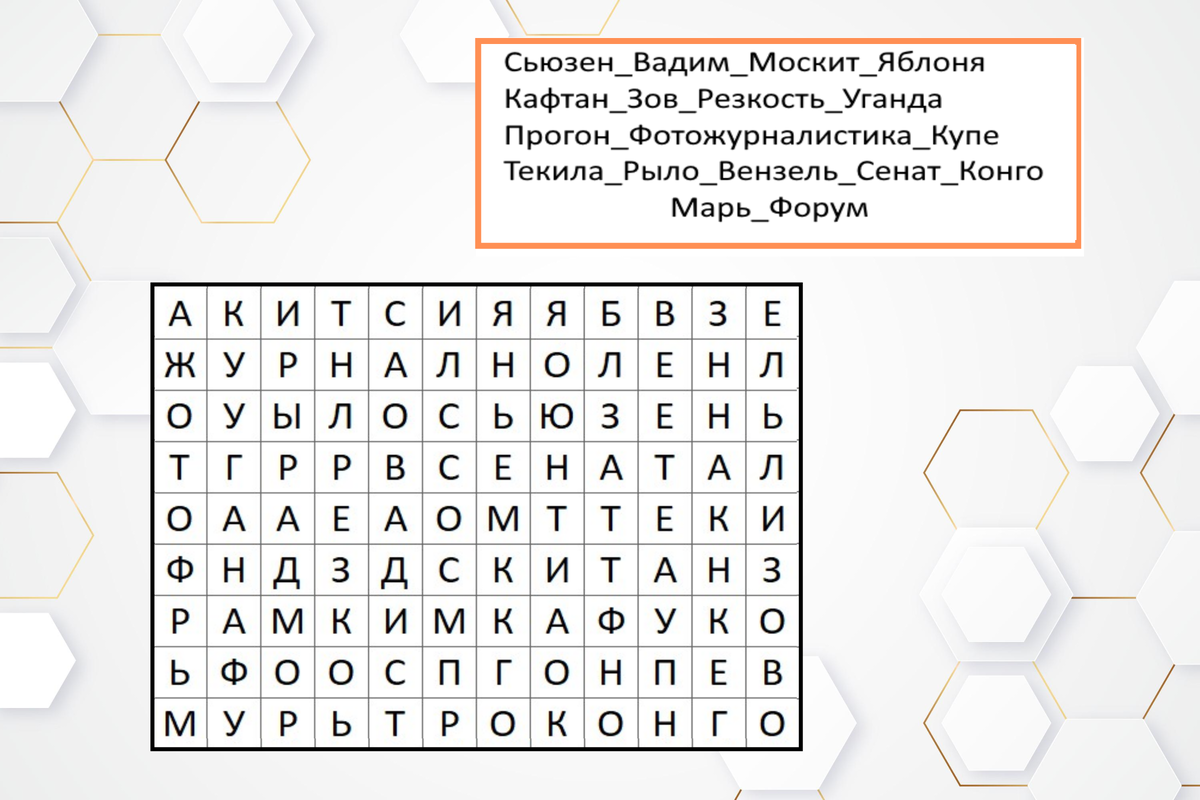 Перед вами поле букв. Среди них зашифрованы слова указанные в оранжевой