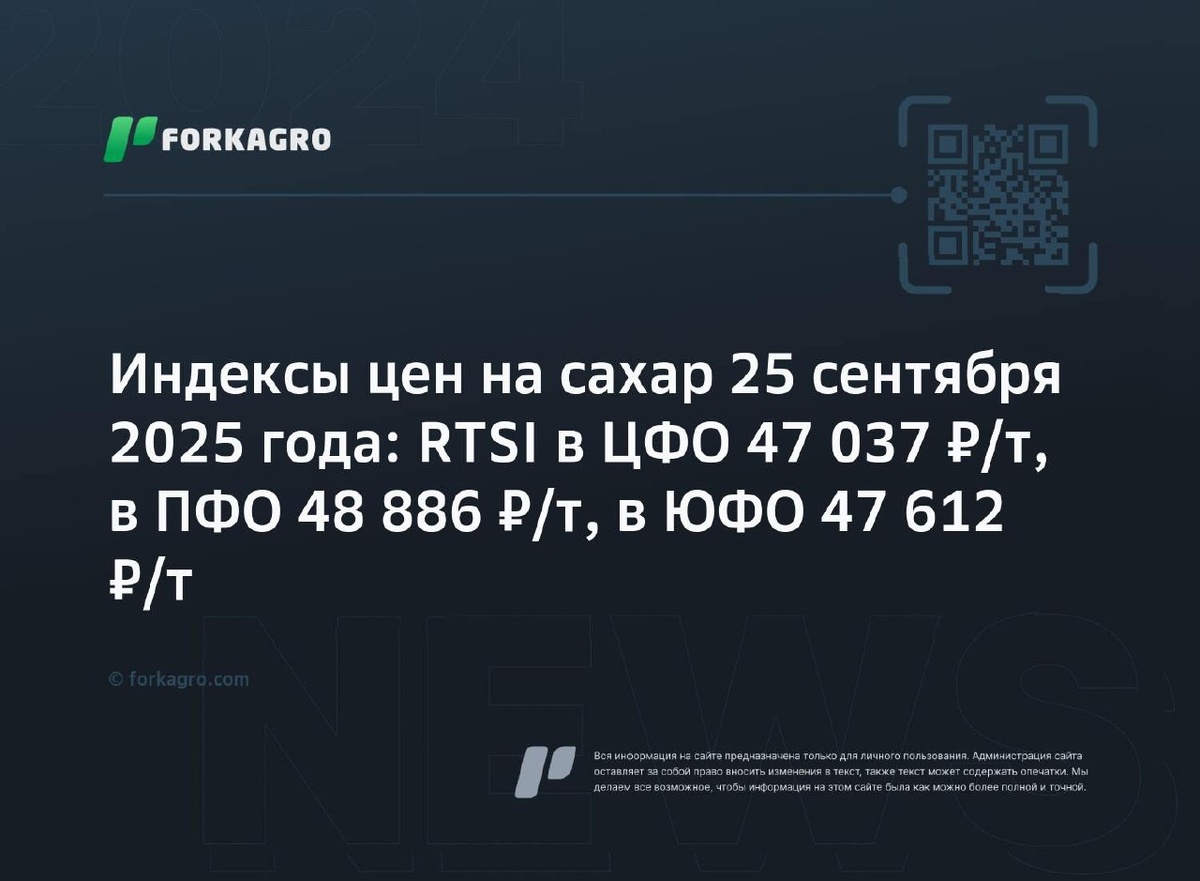Индексы цен на сахар 25 сентября 2025 года: RTSI в ЦФО 47 037 ₽/т, в ПФО 48 886 ₽/т, в ЮФО 47 612 ₽/т