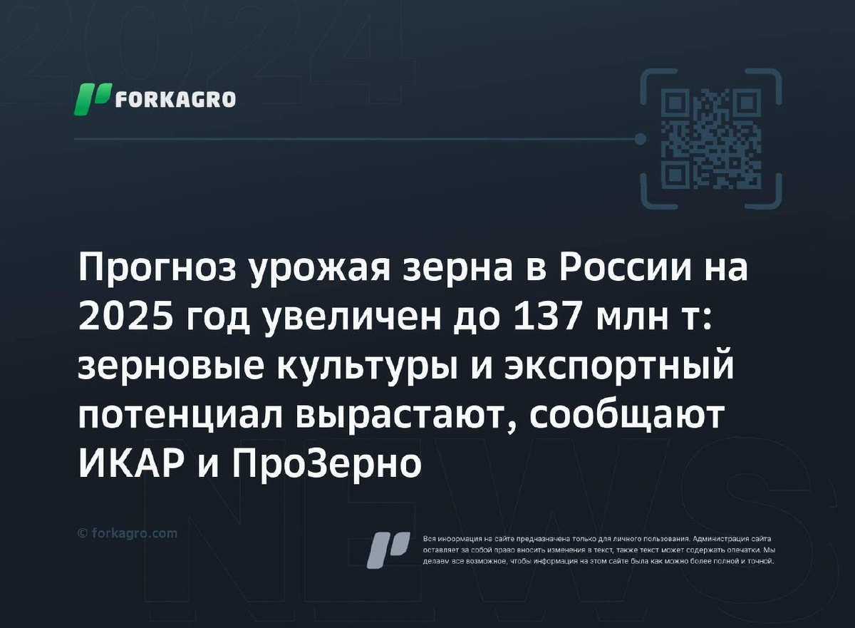 Прогноз урожая зерна в России на 2025 год увеличен до 137 млн т: зерновые культуры и экспортный потенциал вырастают, сообщают ИКАР и ПроЗерно Институт конъюнктуры аграрного рынка (ИКАР) увеличил прогноз производства зерна в России к 2025 году. Прогноз экспортного потенциала пшеницы на сезон 2025/26 повышен до 44,1 млн т. Увеличение урожая связано с Уралом и Сибирью. По оценкам аналитиков, урожай зерновых может достичь 137 млн т, экспортный потенциал составит 56,16 млн т. Российские фермеры уже урожали 121 млн т зерна, ожидается сбор 135 млн т, что обеспечит внутренний спрос и экспортные возможности. Перейти к источнику