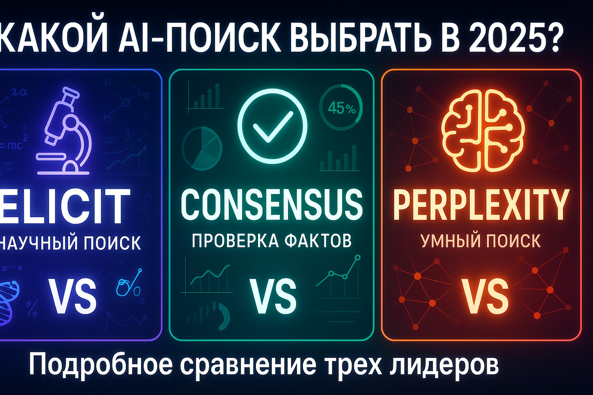 Сравнение топ-3 AI-поисковиков 2025: Elicit, Consensus, Perplexity. Какой выбрать для исследований? Обзор функций, цен и возможностей.