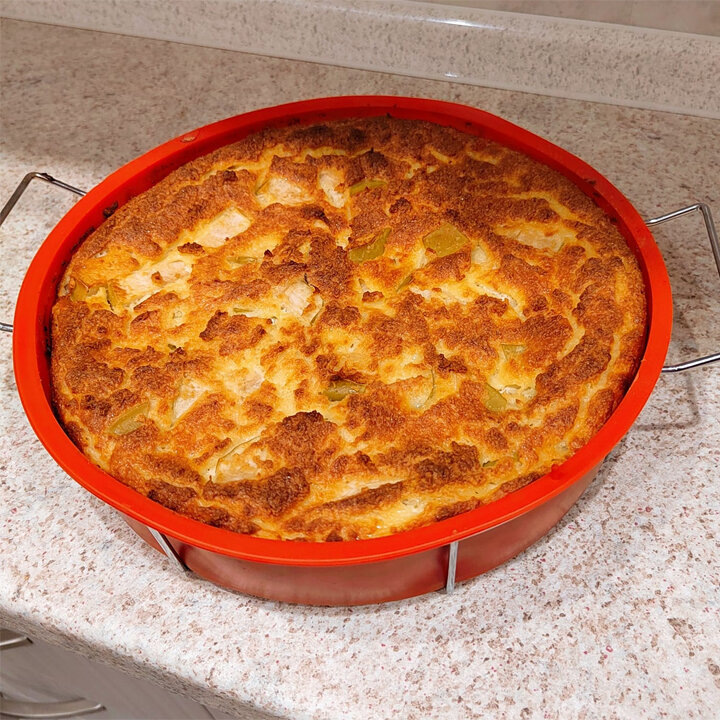 ✓ 600 г жирного (5% или 9%) творога; ✓ 4 крупных яйца (или 5 средних); ✓ 1/2 ч. л. соды; ✓ 1/2 ч. л. уксуса для гашения соды; ✓ Сахарозаменитель - по желанию и вкусу; ✓ 4 ст. л. кокосовой муки; ✓ 2 кислых яблока; ✓ Масло сливочное (для смазывания формы) – 5 г. Творог, яйца, сахзам, гашёную соду смешать и взбить блендером в однородную массу. Добавить кокосовую муку (можно овсянку, перемолотую блендером, тоже вкусно), яблоки, нарезанные на кубики. Перемешать. Выпекать в духовке (200 градусов) 30-40 минут или в мультиварке 50 минут. Мне больше нравится в духовке. КБЖУ на 100 г (творог – 9%)– 147/11,8/8,4/5,7. Рецепт на странице Автор рецепта – Алла Павлова Расчёт КБЖУ сделан с помощью Telegram-чат-бота https://t.me/vesipitaniebot © Почтенный возраст Online и Рецепты для диабетиков