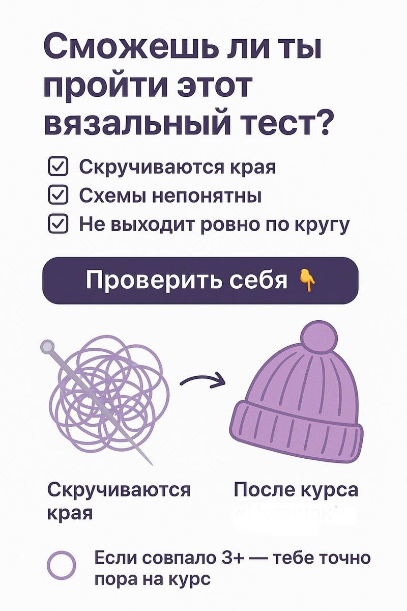 🔍Сможешь ли ты пройти этот вязальный тест? Кажется, что учиться не обязательно? Давай проверим! Если в этих пунктах ты узнаешь себя - значит, курс «Вязание крючком с нуля: первые изделия своими руками за месяц» точно для тебя. 📋 Чек-лист: 🟣У тебя часто скручиваются края, и полотно идёт «волной». 🟣Не знаешь, как красиво закончить изделие, чтобы оно выглядело аккуратно. 🟣Схемы для тебя — набор непонятных значков. 🟣Шапка или салфетка уезжают в размере, и приходится перевязывать. 🟣Хочешь менять цвет нити, но боишься, что переход будет видно. 🟣Никогда не пробовала «пышный столбик» или пико. 🟣Нравятся мотивы, но не знаешь, как их соединять. 🟣При вязании по кругу полотно загибается, и не выходит ровным. 🟣Слышала про «бабушкин квадрат», но так и не связала. 🟣Хочешь связать реальные вещи (шапку, салфетки, украшение), а не только образцы. 🟣Пока не умеешь делать убавления и прибавления в полотне — а это ключевой навык для вязания плечевых изделий (кофты, туники, платья). 📎Итог