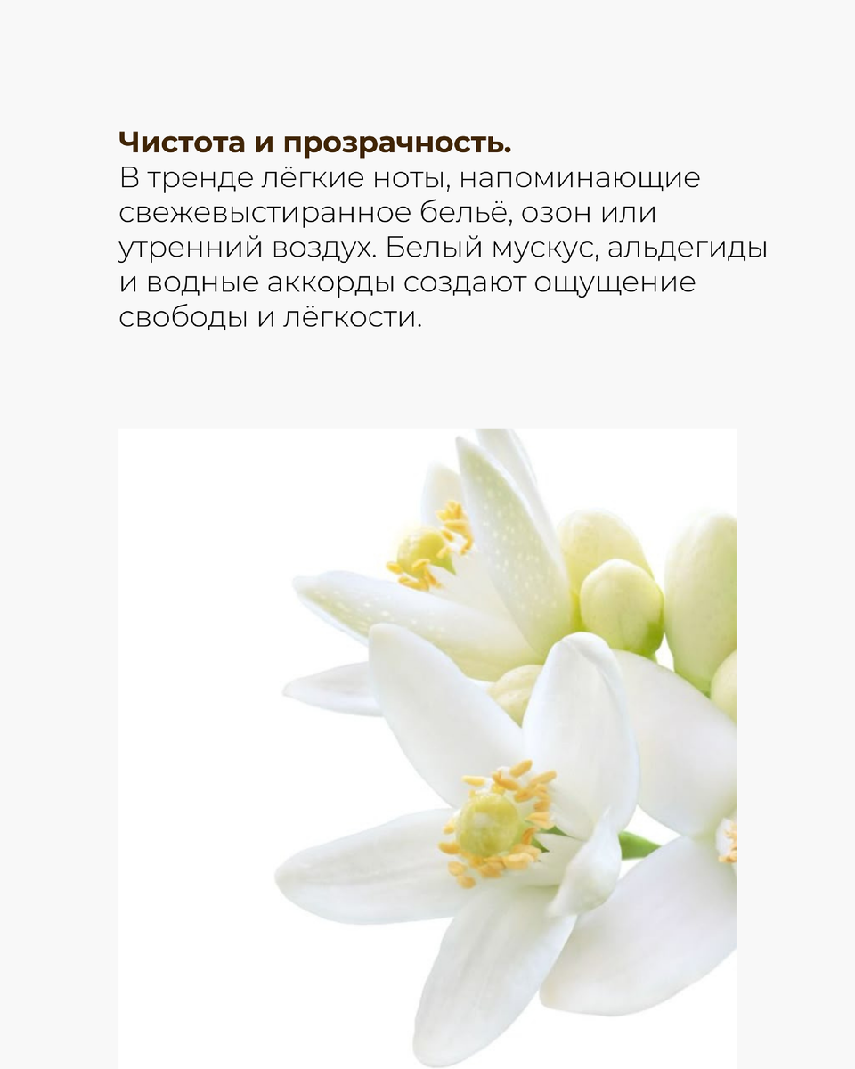 Мода в парфюмерии меняется не реже, чем в одежде. Каждый сезон задаёт новые акценты: какие ароматы будут звучать актуально и современно именно сейчас. Главная идея сезона — натуральность и лёгкость. Аромат больше не должен «кричать», он создаёт настроение и подчеркивает индивидуальность.