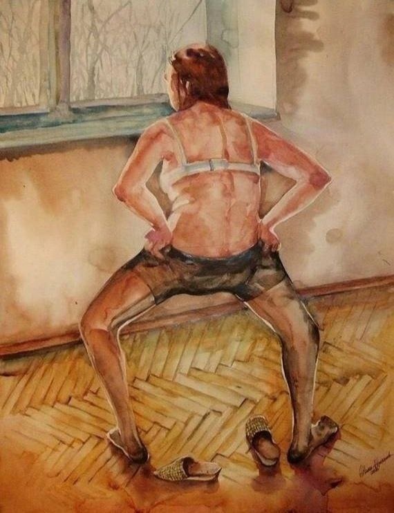 "Женщина, надевающая колготки". (Анастасия Нильская. Акварель. 60х45. 2016)
