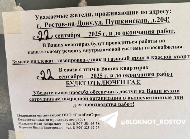 Как рассказал местный житель, в объявлении о проведении работ сроки их окончания не указаны, только начало: 22 сентября. Газ ежедневно используется жителями для нагрева горячей воды, приготовления пищи и отопления. — Управляющая компания молчит! По закону РФ регламент отключения газа не может превышать 24 часов! — уточнил мужчина. При этом в доме идет капитальный ремонт, его обещают закончить 25 декабря 2025 года. Ситуацию прокомментировал ответственный за ходом работ Иван Малыхин. Он рассказал, что к следующей неделе, вторнику-среде будут закончены работы в третьем и четвертом подъездах, сейчас в первом подъезде дома газ уже есть. Ранее «Блокнот Ростов» писал, как в донской столице 69 лет назад были газифицированы первые жилые дома. Тогда горожане впервые смогли оценить удобство газового отопления и приготовления пищи, став пионерами новой коммунальной эры. Григорий Мелихов