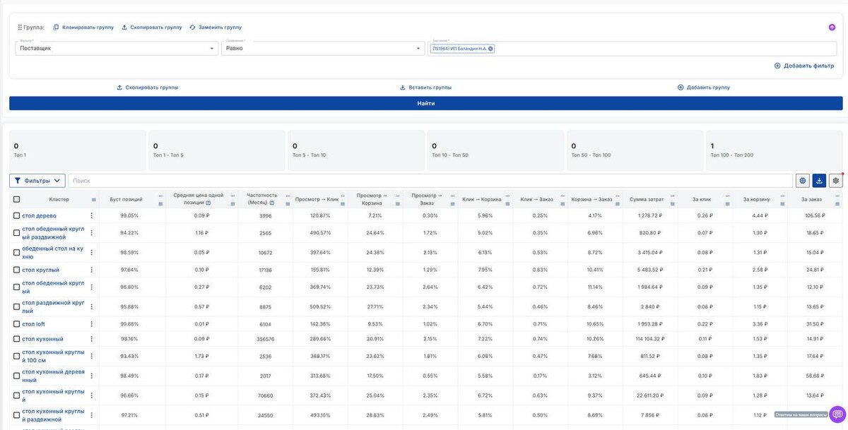 Мы с MP Manager ещё год назад обсуждали, чтобы статистику по ключам соединить с конверсиями И вот долгожданные обновления сервиса: Скрин №1 В SEO - Подбор сделали по всем опубликованным Wildberries ключам такой отчёт. Можно смотреть по кластерам, а можно смотреть отдельно по каждому из слов. Данные из расширенного джема. CTR выше 100%, потому что он такой на Wildberries в джеме, на 1 просмотр может быть по несколько кликов, добавлений в корзину, нажатий на избранное и тд, всё это вб считает кликами Скрин №2 Аналогично всё можно посмотреть по кластерам в течение времени И как частотности росла/падала. И как конверсии по каждому дню росли/падали Скрин №3 Так же можно объём рынка оценить, по кластерам Скрин №4 Можно ключи найти, у которых конверсия из клика в заказ больше 20% Скрин №5 А можно сразу по поставщику выгрузить все ключи, в отчёте средние показатели из джема Ещё можно свои рекламные ключи посмотреть и сравнить с Wildberries Очень важные метрики для анализа работы на м