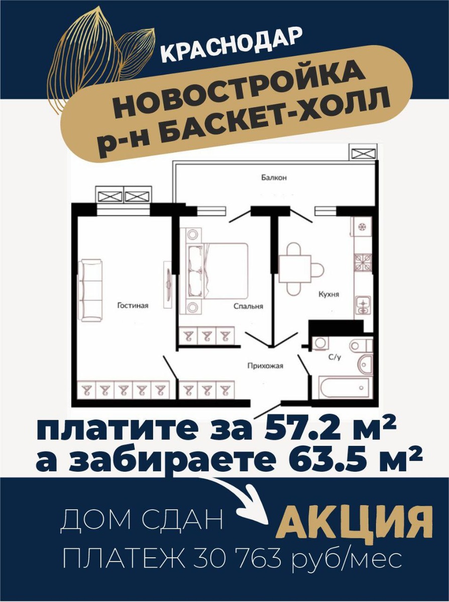 Жилой комплекс расположен в микрорайоне Баскет-холл (Краснодар) В пешей доступности школы и детские сады, ТРЦ "Красная, Площадь", футбольная академия "Краснодар" Акция: Платите за S - 57,2м2, а забираете квартиру 63,5 м2 Этаж именно этой квартиры: 4 Без ремонта Дом сдан ❌Платёж тех, кто не знает об Акции - 31 582 руб/мес ✅Платёж моих подписчиков - 30 763 руб/мес Первый взнос - 1 291 000 руб Стоимость - 6 421 981 руб Ипотека - 5 130 981 руб Для Вас максимальная скидка в день брони 👌 💥Также, по Акции, можно взять 1-к квартиру с ГОТОВЫМ РЕМОНТОМ и платежом 30 973 руб/мес Уточняйте актуальность, хорошие предложения уходят быстро 🔆Подберу лучший вариант для инвестиции или Вашей новой истории, будь то квартира в новостройке, таунхаус, коттедж, коммерция, апартаменты, номер в отеле или дом от застройщика 💪Пока никто не знает, а мы с Вами выбираем самые крутые и выгодные варианты! Мои контакты: +79184245419 +79282915705 Лана 📲Напишите на WhatsApp: https://wa.me/message/AF