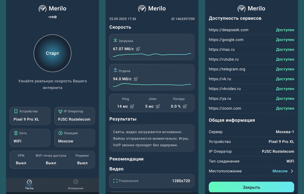 Появилась еще одна альтернатива заблокированному в России SpeedTest. Приложение Merilo, разработанное компанией Vigo, доступно в магазине приложений RuStore, в Google Play найти его не удалось. Само приложение довольно легковесное и по функциональности повторяет SpeedTest, причем по нашему ощущению (скриншоты сделаны со смартфона в редакции) работает пошустрее. По крайней мере, пакеты точно прокачиваются меньшего объема, что позволяет тестировать скорость быстрее. Неожиданной и в то же время полезной оказалась проверка доступности сайтов сервисов, причем не только российских, но и зарубежных. Полезна она в том случае, если вы начинаете подозревать, что находитесь в зоне ограничения мобильного интернета: в списке сервисов есть те, которые находятся в белом списке МинЦифры, а значит, они будут доступны, а другие – нет. Удобно, но, надеемся, востребованной такая функция будет недолго. Что же касается компании Vigo, то о ней мы услышали в первые относительно недавно: один из операторов рас