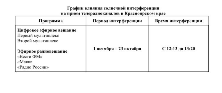 🖌Солнечная интерференция не окажет влияния на телевещание РТРС в Красноярском крае 📡В Красноярском крае с 1 по 23 октября возможна солнечная интерференция, которая может временно повлиять на телесигнал. Однако благодаря цифровым технологиям РТРС воздействие интерференции сведено к минимуму, и большинство зрителей не заметят изменений в качестве изображения. График влияния интерференции опубликован на сайте ртрс.рф и в мобильном приложении «Телегид». #РТРС #газетаСибирскийХлебороб #солнечная_интерференция