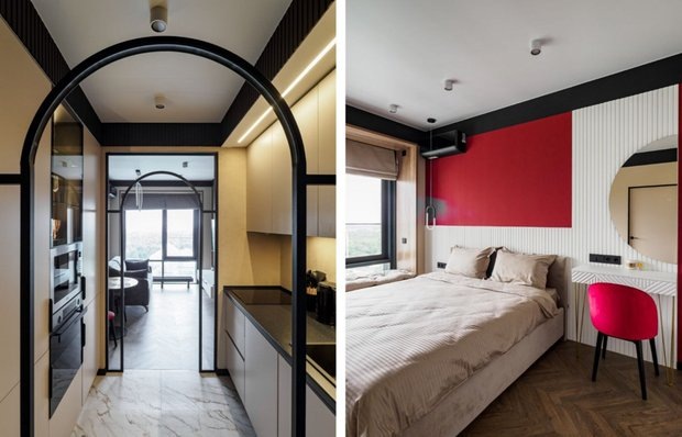 Порция классных идей для вашего вдохновения! Квартира площадью 38 кв. м в новом жилом комплексе «VERY на Ботанической» от ГК «Основа» — яркий пример того, как можно гармонично сочетать функциональность и эстетику. Показываем 8 удачных решений, которые создают уникальную атмосферу и повышают комфорт жизни. Кухню сделали проходной: с одной стороны располагаются рабочая зона, варочная панель и мойка, с другой — шкафы-пеналы со встроенной техникой и местами для хранения. Над СВЧ и духовкой фасад выполнен из тонированного стекла с подсветкой — за ним можно хранить красивую посуду. Такая компоновка пространства функциональна и визуально увеличивает размер кухни. Удобное расположение всех элементов делает процесс приготовления пищи более комфортным и быстрым. Использование бордового цвета в интерьере придает жилым комнатам выразительность. На закате этот цвет выглядит особенно насыщенно, при этом он остается гармоничным и не вызывает раздражения. Остальные стены выполнены в светлых нейтральны