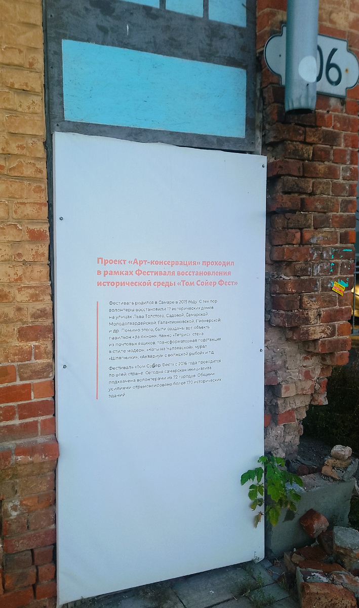 «Арт-консервация» в Самаре — волонтёрский проект, цель которого — сохранить культурное наследие города и привлечь внимание общественности к проблеме сохранения исторических зданий. Суть проекта: вместо обычного заколачивания окон и дверей фанерой волонтёры вручную разрисовывают щиты, которые закрывают дома, придавая им новый эстетический вид. Здание на Ленинской, 104-106 стало первым в проекте «Арт-консервация».
