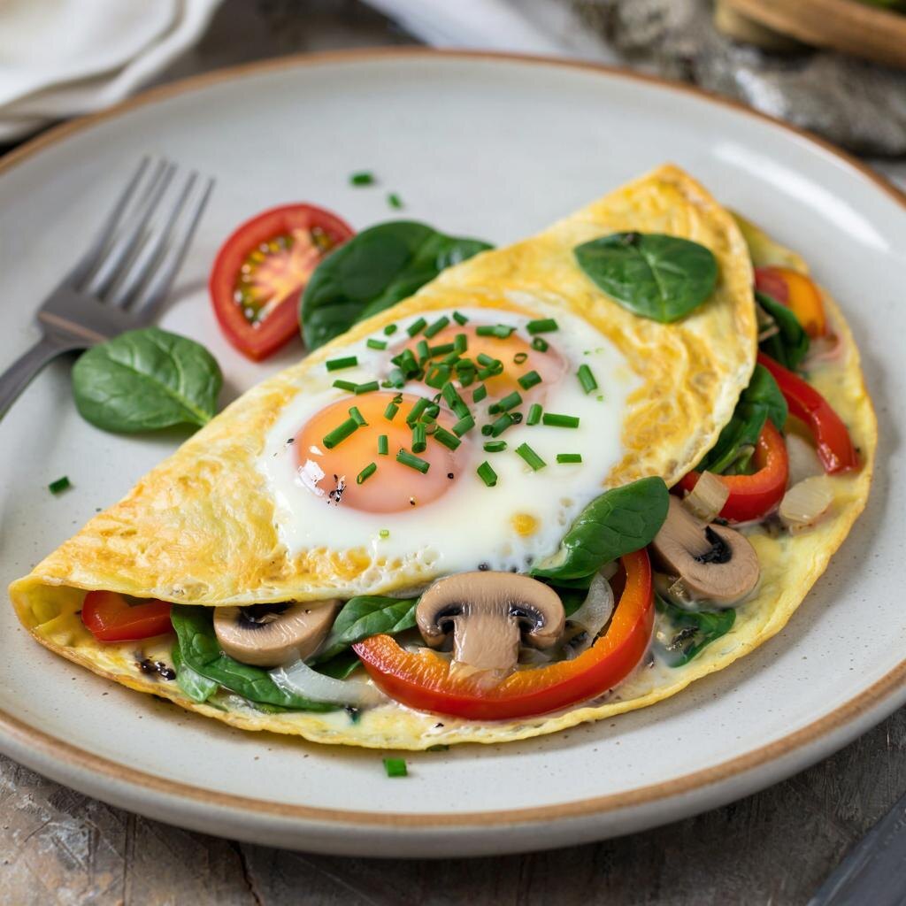 Овощной омлет — это вкусное и питательное начало дня! Он легко готовится и может быть адаптирован под ваши любимые овощи. Давайте разберем, как его приготовить! Ингредиенты: - 3 яйца 🥚 - 1/4 чашки молока 🥛 - 1/2 чашки свежих овощей по вашему выбору (помидоры, шпинат, перец, грибы, кабачки и т.д.) 🍅🥒 - 1/4 чашки тертого сыра (по желанию) 🧀 - 1/4 чайной ложки соли 🧂 - 1/4 чайной ложки черного перца 🧂 - 1 столовая ложка оливкового масла или сливочного масла 🛢 - Свежая зелень для подачи (петрушка, укроп или базилик) 🌿 Приготовление: 1. Подготовка овощей: - Нарежьте выбранные овощи небольшими кусочками. Если вы используете грибы, обжарьте их на сковороде несколько минут, чтобы убрать лишнюю влагу. 2. Взбивание яиц: - В миске взбейте яйца с молоком, добавьте соль и перец. Хорошо перемешайте до однородной массы. 3. Готовка на сковороде: - На среднем огне разогрейте сковороду и добавьте оливковое масло. - Как только масло прогреется, добавьте нарезанные овощи и обжаривайте их в течени