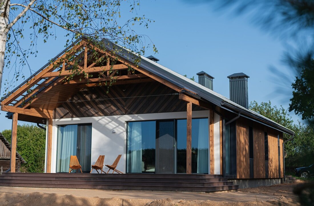 Здесь сложно не согласиться – с первого взгляда и издалека вам точно может показаться, что дом вполне привычный и из деревенской застройки не сильно выделяется – на крыше шифер, фасад обшит доской. Но это лишь первое впечатление и визуальный фокус – в какой деревне вы видели хаты с панорамными окнами и лиственничным планкеном?