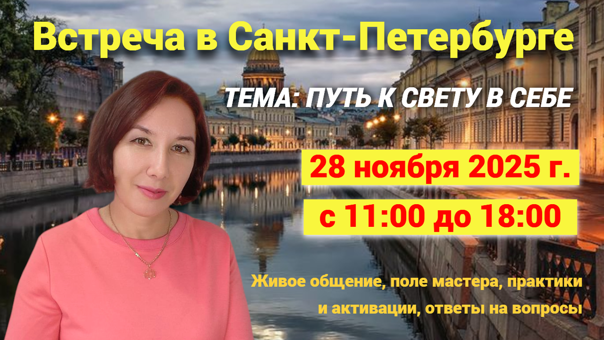 Родные мои, вот и пришло время нам встретиться в материальном плане. Я приглашаю всех желающих на живую встречу со мной в г. Санкт-Петербург. Живая встреча — это чудесное общение и мощное духовное раскрытие, наполнение энергией и волшебная трансформация. ТЕМА ВСТРЕЧИ: Путь к Свету в Себе В ПРОГРАММЕ ВСТРЕЧИ: Усиление вашей Божественной Поддержки, помощь Светлых сил, ещё большее раскрытие своим Световым Помощникам. Разнообразные практики со Светлыми силами. Энергетическая поддержка, очищение ауры и всех тонких тел, активации и всевозможные раскрытия. Настройка вас на высокие вибрации. Потоковая передача для вас информации и энергий. Беседа и ответы на волнующие вас вопросы. ПРАКТИКИ И АКТИВАЦИИ: ДАТА ВСТРЕЧИ: 28 ноября 2025 г. в Санкт-Петербурге С 11:00 до 18:00 МЕСТО ПРОВЕДЕНИЯ: Йога-центр «Сфера» по адресу: