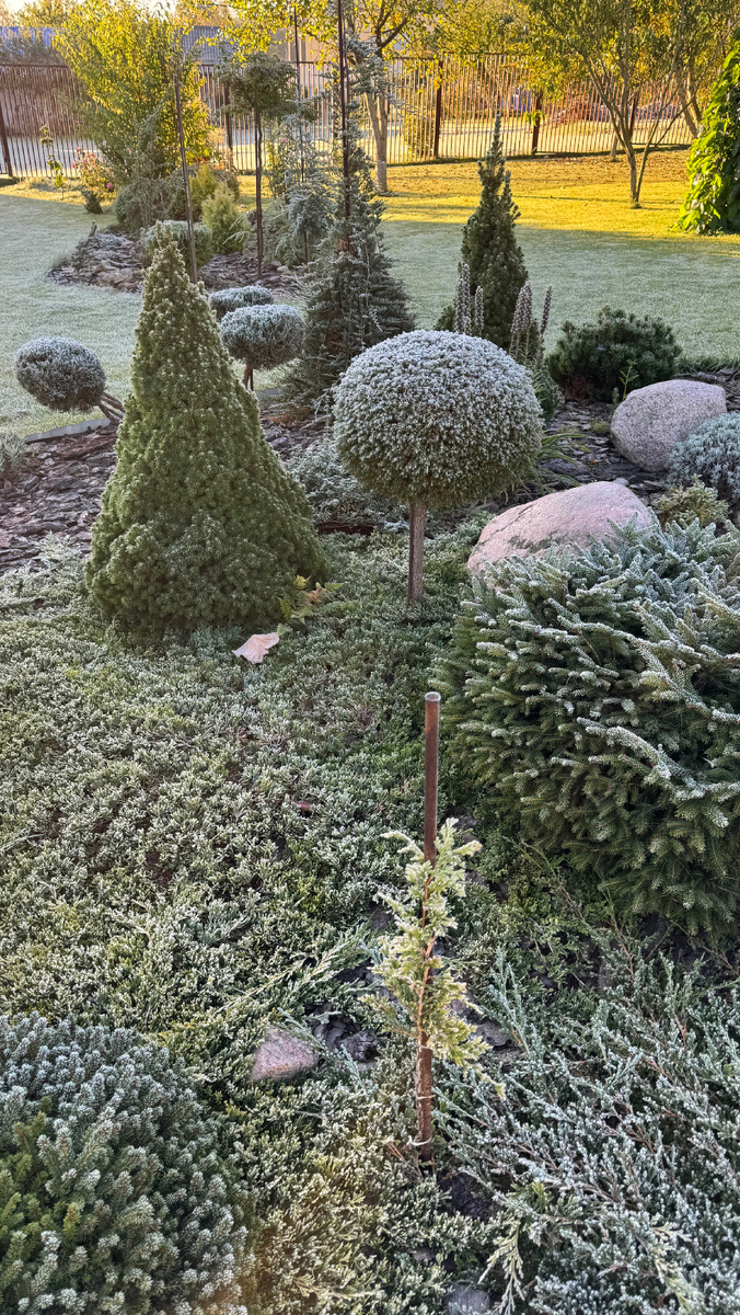 Вот и прошло лето. Первые слова, которые приходят на ум, когда утром видишь белый морозный иней в саду, покрывший все цветы, листья и хвою. На хвойных деревьях он смотрится красиво, спокойно и даже уютно. Но погода неумолимо меняется, и температура опускается ниже нуля. Что ж, каждая иголочка на ёлках блестит, и в этом есть своя прелесть. Однако, глядя на метельчатые гортензии, невольно становится грустно. Ведь ночью было уже минус три, а на календаре — только конец сентября. У нас, в Беларуси, плюсовая температура днём может держаться аж до декабря, а настоящие морозы приходят лишь в январе-феврале. Но ночные заморозки уже вступают в свои права, забирая у меня лето. 😢 Гортензии мне очень жалко. Смотрю на них, покрытых инеем, — с одной стороны, это красиво, а с другой — понимаю: когда взойдёт солнце и иней растает, большинство соцветий превратятся в коричневые и неживые цветы. Как, например, у моей гортензии «Полярный медведь», которая уже начала буреть, одним бочком. Декоративност