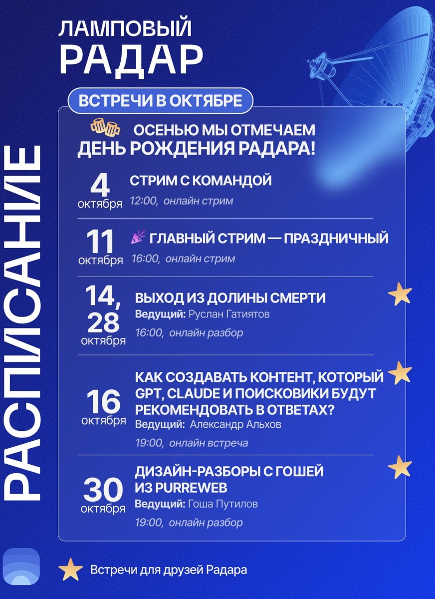 ⚡️ Октябрь – календарь мероприятий сообщества Product Radar В октябре Радар отмечает свой второй день рождения. Мы решили провести сразу два праздничных стрима, чтобы как следует отметить важную дату: 🍕Стрим с командой Радара 🔴4 октября, 12:00 (МСК) на котором поговорим о важных событиях за год и развитии площадки. 🎉Главный праздничный стрим с гостями 🔴11 октября, в 16:00 (МСК) поговорим с охотниками Радара про самые яркие примеры проектов из нашего стартап-сообщества и планы на следующий год! И, конечно, по традиции, задуем свечи на тортике 🎂 〰️〰️〰️ 🖥 Онлайн-встречи для Друзей Получить доступ в наше закрытое сообщество и возможность ходить на эфиры можно по ссылке: ⭐️productradar.ru/friends⭐️ «Как создавать контент, который GPT, Claude и поисковики будут рекомендовать в ответах? Делаем AEO и GEO оптимизированный контент» 🔴16 октября, 19:00 (МСК) Ведущий: Александр Альхов Эксперт бизнес-акселератора ФРИИ, ИТМО, ВШЭ Практик с опытом роста Edtech, HRtech и SaaS-проектов «Вы