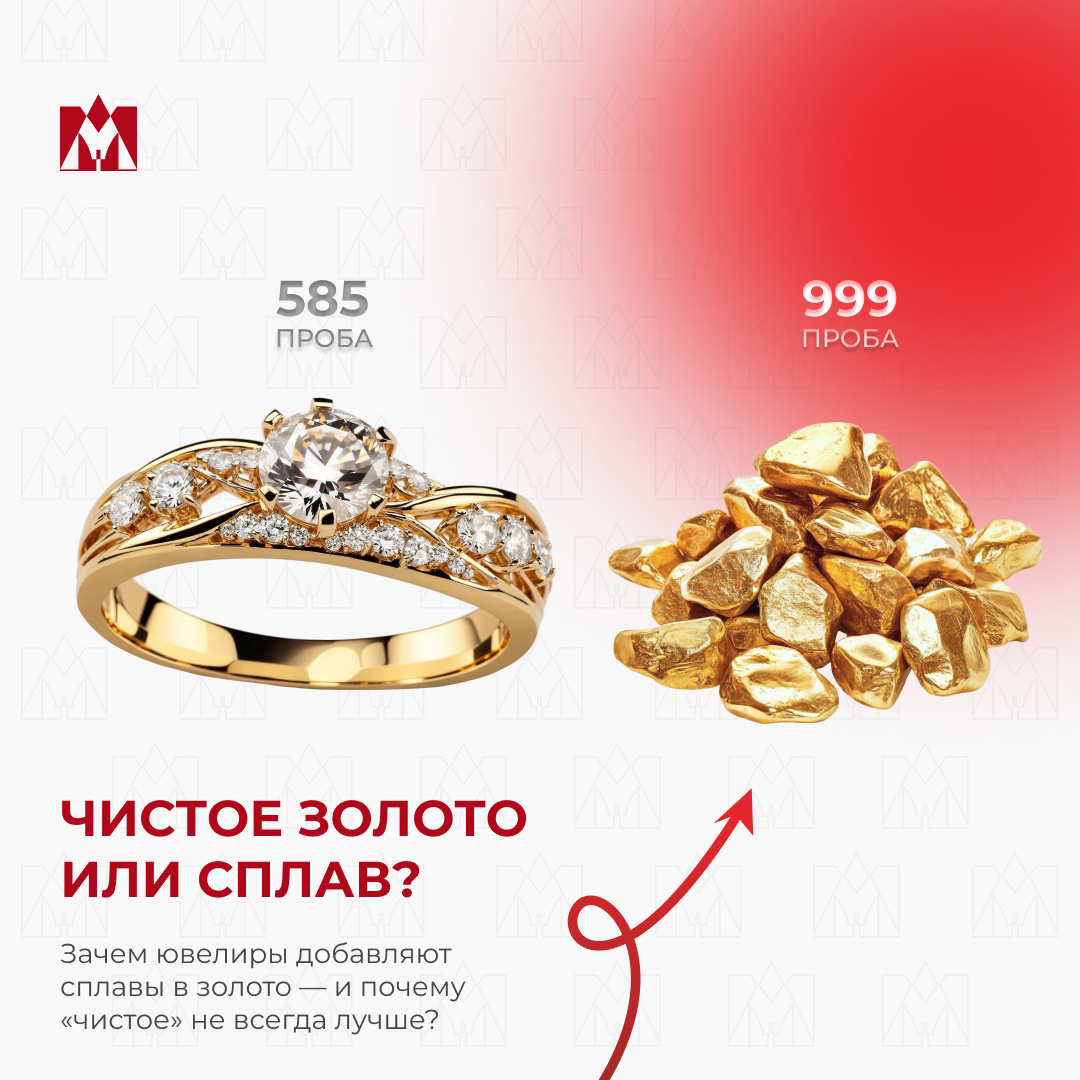 Многие думают, что чем чище золото, тем оно ценнее. Вроде логично — ведь 999 проба (почти чистое золото) стоит дороже. Но если речь идёт не о слитке в банке, а о кольце, браслете или серьгах, то всё немного сложнее. Давайте разберёмся, почему «чистое» золото — это не всегда хорошо, а сплавы в ювелирных украшениях играют ключевую роль. 1️⃣ Чистое золото слишком мягкое Золото 999 пробы похоже скорее на пластилин, чем на металл: его легко поцарапать, помять, даже согнуть пальцами. Кольцо из такого золота очень быстро потеряет форму и будет выглядеть «уставшим». Именно поэтому в создании ювелирных изделий практически не используют золото выше 750 пробы. 2️⃣ Сплавы делают украшения долговечнее Чтобы изделие служило десятилетиями, к золоту добавляют другие металлы: • медь — придаёт прочность и тёплый оттенок, • серебро — делает сплав более пластичным, • палладий, никель или платина — усиливают твёрдость и «отбеливают» золото. Так рождаются привычные нам 585 и 750 пробы — именно они чаще всег